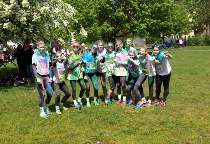 Så bar det iväg. Bra tempo av samtliga tjejer, men då vi förstod rätt tidigt i loppet att resten av startfältet (10 000 deltagare och nordiskt rekord!) inte var några direkta atleter så blev det fem kilometer slalom och tvärnitningar. De gående som skulle hålla till höger, gick armkrok och sex stycken i bredd. Yes. Aja, vi klagar inte! Det var ändå fantastiskt roligt! Och höjdpunkterna i loppet var såklart färgstationerna där tjejerna blev dränkta i alla möjliga färger. De älskade det, och alla andra också! Så stämningen var på topp! Lite svårare för en kycklingmamma som jag som ville räkna in mina flickor sjuttioelva gånger och tillslut med all färg så såg varenda löpare likadan ut. Alla tog sig i iallafall i mål och ingen hade en enda ren fläck på kroppen som varken var grön, gul, blå eller rosa, och alla tjejer var hur lyckliga som helst! Och det var ju ändå målet med denna dag, att ha en rolig dag tillsammans!