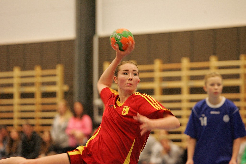 Alexandra Schaerlund (bild), gör mål på ett av många straffkast under lördagen i Upplandströjan. Foto: Robert Zetterquist
